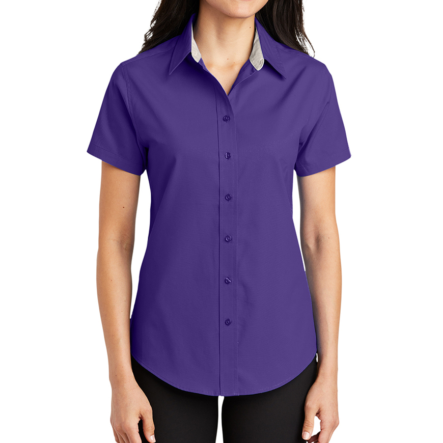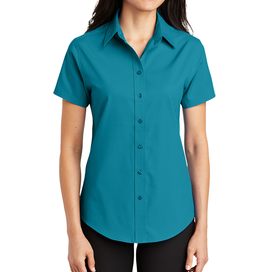 Port Authority Ladies Short Sleeve Easy Care Shirt Effortlessly elevate your look with the Port Authority Ladies Short Sleeve Easy Care Shirt Featuring a sleek open collar and impeccable tailoring, this shirt ensures you make a lasting impression wherever you go The dyed-to-match buttons add a polished touch, while its wrinkle-resistant fabric keeps you looking fresh all day Crafted from a comfortable blend of 55% cotton and 45% polyester, it’s the perfect blend of style and practicality